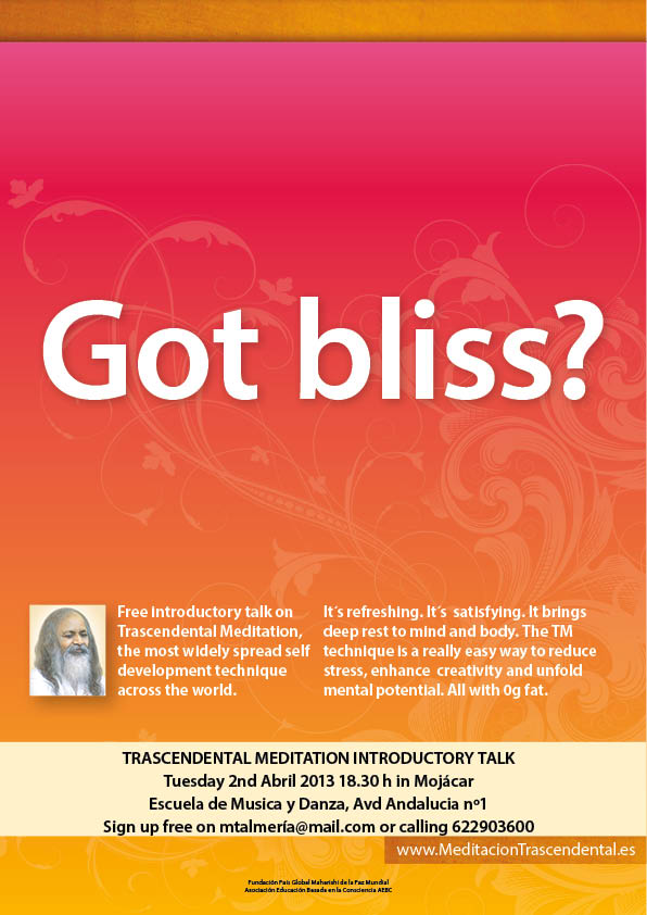 Trascendental Meditation Intro Talk 2nd Abril in Mojácar Escuela de Música y Danza at 18.30 in English