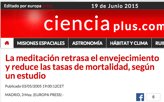 La Meditación Trascendental puede retardar el envejecimiento según publica EUROPA PRESS: La meditación retrasa el envejecimiento y reduce las tasas de mortalidad. Leer el artículo aquíLa meditación, empleada como método de relajación, ralentiza el envejecimiento y reduce las tasas de mortalidad, según se desprende de las conclusiones de un estudio del Centro de Medicina Natural y Prevención de Estados Unidos. Los estudios publicados muestran que los practicantes de Meditación Trascendental disfrutan de vidas más largas que los grupos control que no meditan. Y no sólo es la longevidad mejorada – los que la practican llevan también una vida más plena y vigorosa ya que sus procesos neurofisiológicos de envejecimiento se retrasan considerablemente. Sin duda, la práctica regular de MT puede hacer su vida más agradable y equilibrada. ¿Estás listo para disfrutar de los beneficios? Si quieres empezar con tu Meditación Trascendental el primer paso será asistir a una sesión introductoria en tu centro más cercano, por video conferencia para recopilar toda la información que necesites y dar respuesta a tus preguntas. Además ahora disfruta de cuotas más bajas.